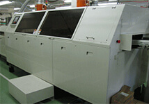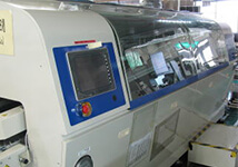Lサイズ基板の自動はんだ付が可能です。電磁誘導式はんだ槽はポンプ式に比べて噴流波の変動が少なく、良好なはんだ付が可能です。